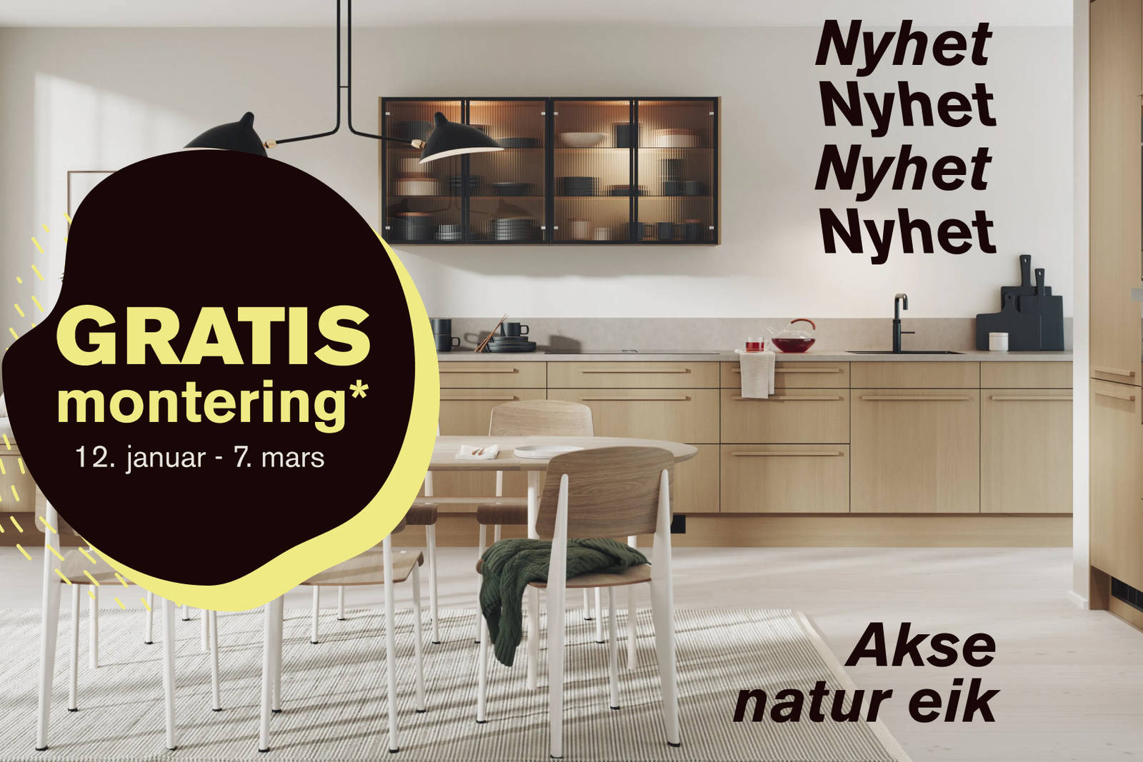 * Tilbudet gjelder Home Collection fra 12. januar - 7. mars med levering innen 30. april 2026. Gjelder ved kjøp av komplett kjøkken. Maks avstand på montering fra butikk er 50 km. På Basic Collection gis 25% rabatt.