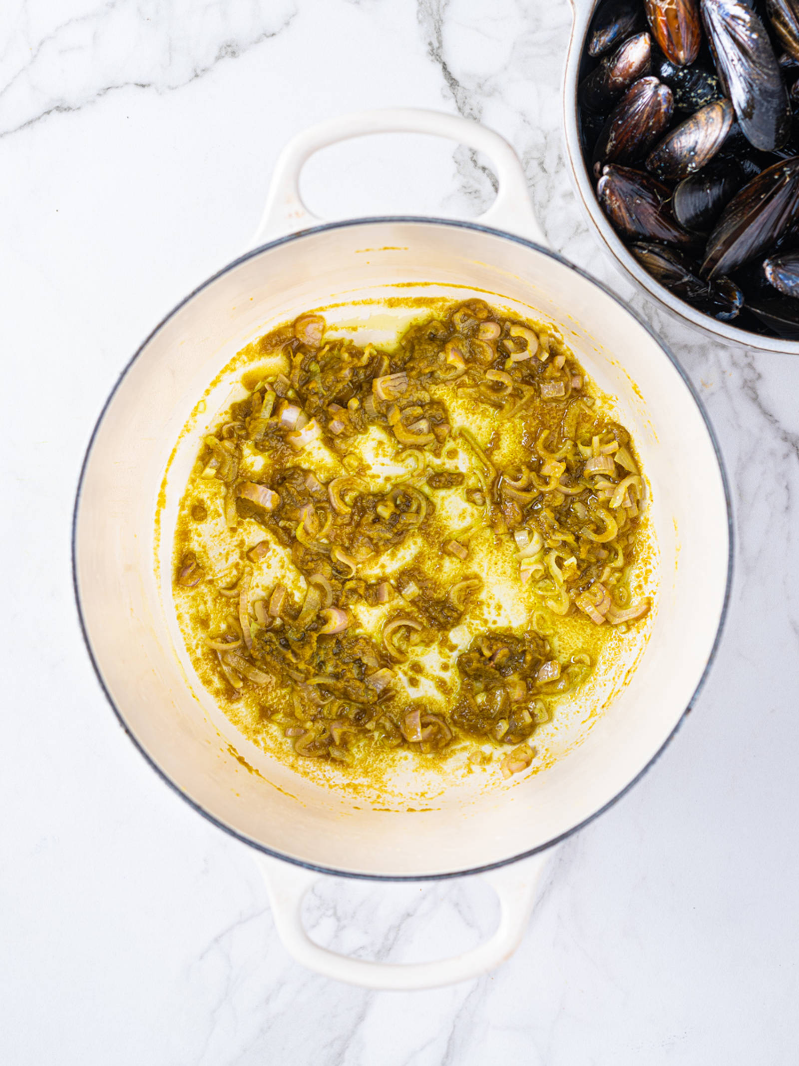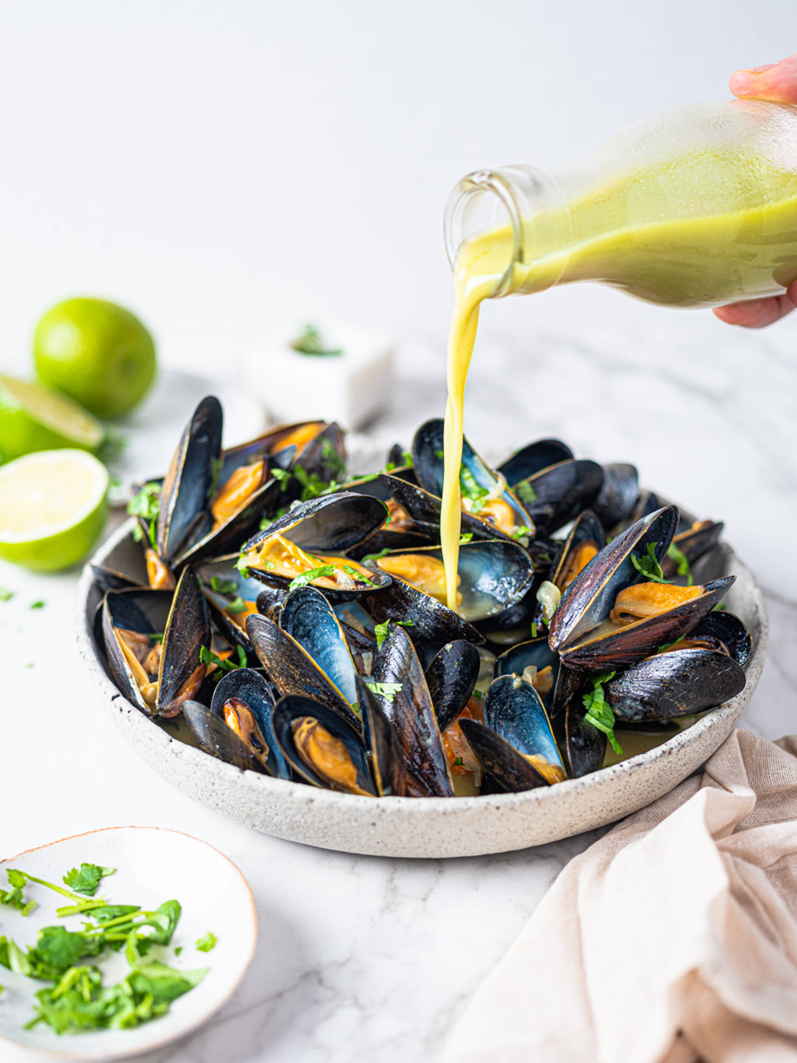 Rens blåskjellene. Finhakk sjalottløken og korianderen. Fres sjalottløken i olje i en kjele under omrøring i ett minutt. Tilsett curry paste og stek i ytterligere ett minutt. Ha blåskjellene og kokosmelken i kjelen. Sett på lokk og la dampe i ca. Tre minutter til blåskjellene åpner seg. Hold på lokket og rist lett på kjelen halvveis. Press over limesaft og strø over koriander før servering.