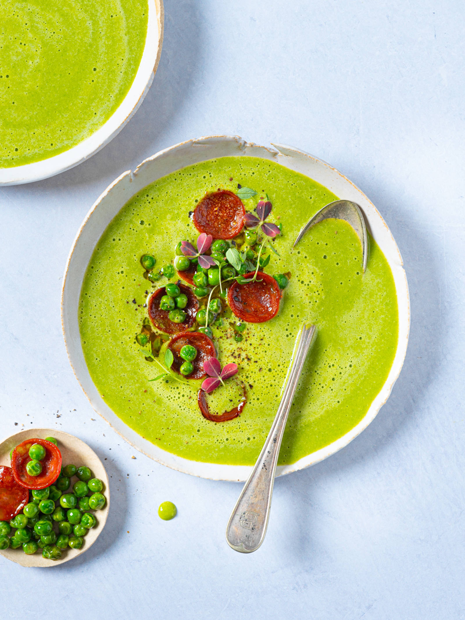 Finhakk løk og hvitløk. Stek løk på middels varme i 2 minutter under omrøring. Ha i erter og kraft. La koke i to minutter. Kjør suppen jevn med en stavmikser eller i en foodprosessor. Tilsett fløten. Hvis du vil ha en luftigere suppe, kan du piske fløten til løs krem og vende den inn i suppen like før servering. Smak til med sitronsaft, salt og pepper. Topp suppe nmed chorizo, løk og grønne erter som du freser raskt i panna og pynt med frisk timian.